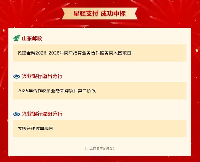 近日,星驛支付憑借卓越的技術實力、專業的團隊素養以及在數字商業領域豐富的項目經驗,歷經多輪嚴格評審,成功中標山東郵政及興業銀行南昌分行、沈陽分行重要合作項目。此次中標全方位覆蓋并精準響應千行百業商戶在數字化經營中的多樣化需求,并為山東郵政及興業銀行各分行的金融業務發展提供強有力的支撐,更為構建多方共贏的數字商業生態奠定堅實基礎。是星驛支付在聯合收單領域取得的又一次重要突破。